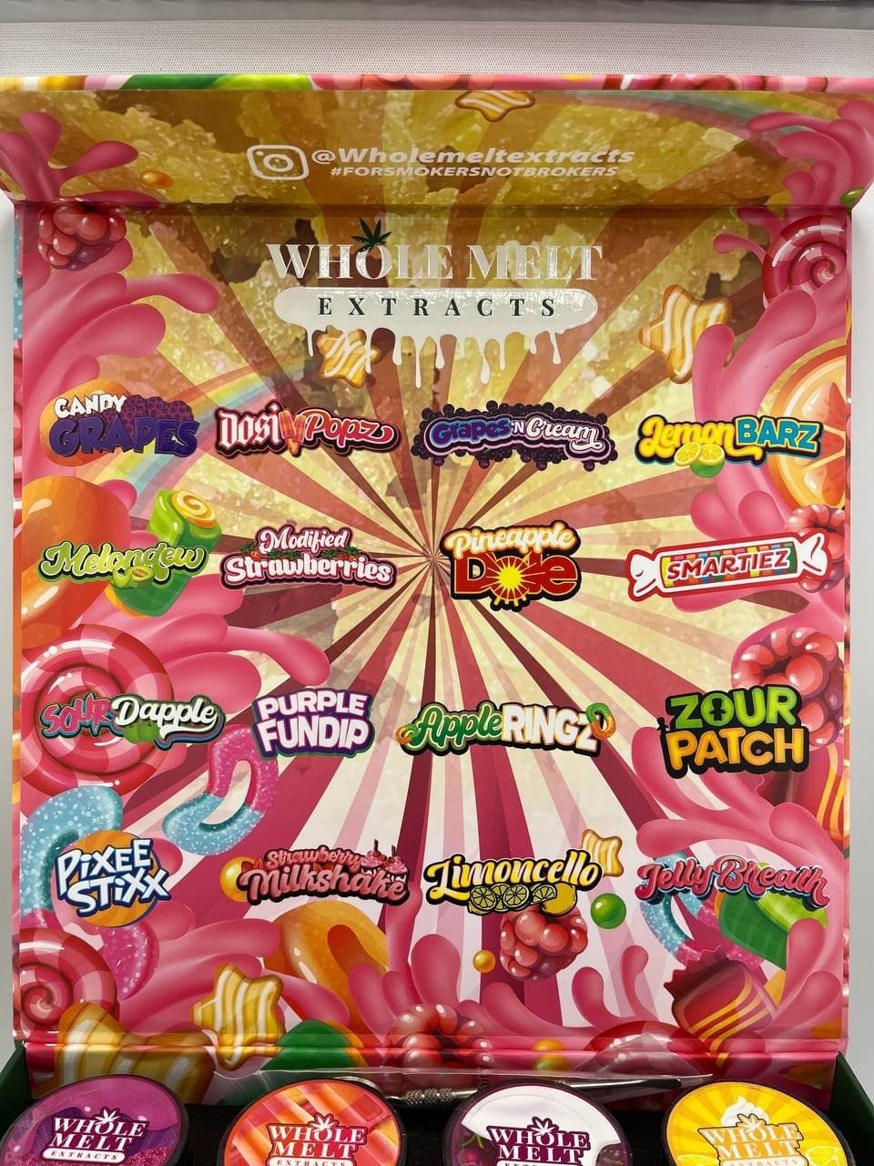 Whole Melt Candy Edition is an exclusive line of live resin sugar concentrates strains created for cannabis enthusiasts seeking an exceptional flavor experience. Crafted with precision and care, Whole Melt concentrates offer a wide selection of strains to cater to diverse preferences. Each product in the Whole Melt collection is carefully crafted to ensure a potent blend of cannabinoids and terpenes, resulting in a unique and unparalleled sensation. By prioritizing quality and flavor, Whole Melt concentrates guarantee a seamless vaporization process that elevates the distinctive taste of each strain. Discover the extraordinary combination of exceptional quality and unparalleled taste with Whole Melt.